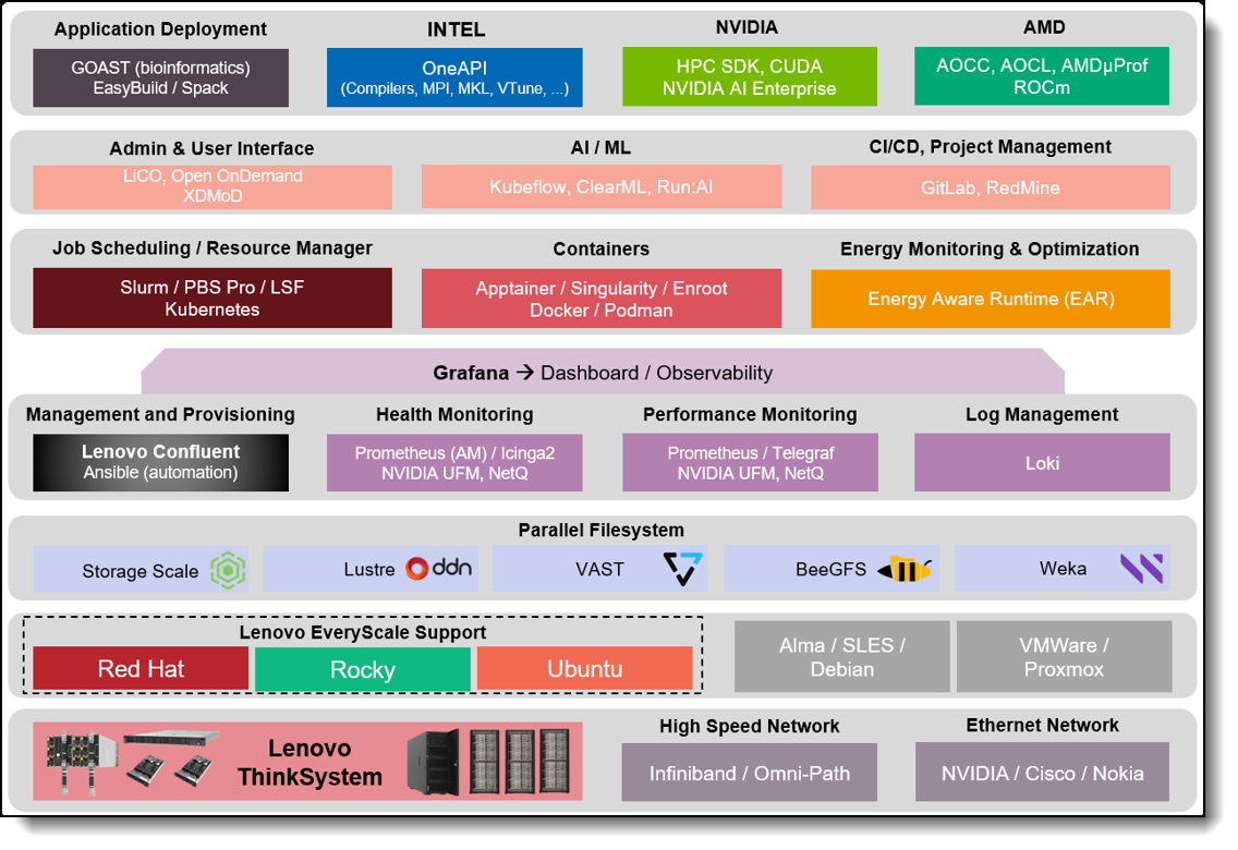 The Lenovo EveryScale HPC & AI Software Stack is fully tested, supported and periodically updated to combine the latest open-source HPC software releases, enabling organizations with an agile and scalable IT infrastructure.