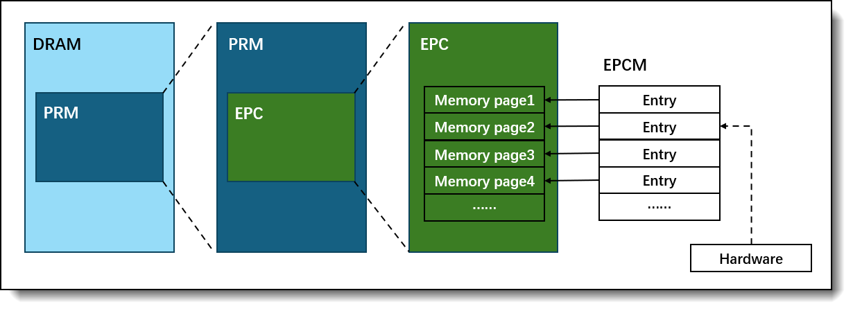 - PRM (Processor Reserved Memory): The pre-reserved memory on DRAM used by SGX.