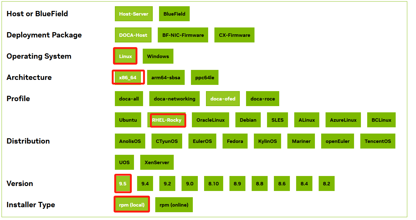 https://developer.nvidia.com/doca-downloads?deployment_platform=Host-Server&deployment_package=DOCA-Host - Make the selections on the web page appropriate for your server: