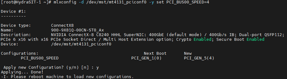 # mlxconfig -d devicename -y set PCI_BUS10_SPEED=4