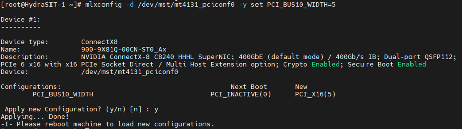 # mlxconfig -d /dev/mst/mt4131_pciconf0 -y set PCI_BUS00_WIDTH=5 - Set the CX8 adapter to the PCIe Gen5 using the following command, as shown in the following figure.