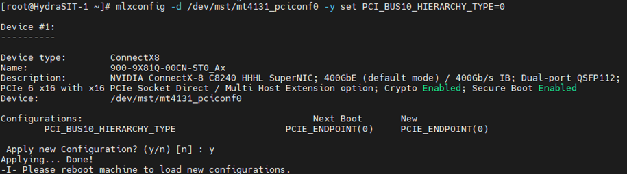 # mlxconfig -d /dev/mst/mt4131_pciconf0 -y set PCI_BUS10_HIERARCHY_TYPE=0 -