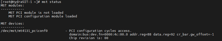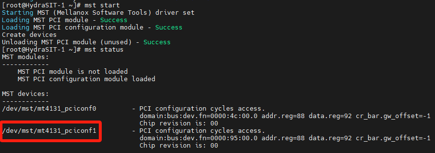 Run the mst start and mst status commands. You should see in the out that there is now an additional device, as highlighted in the following figure.