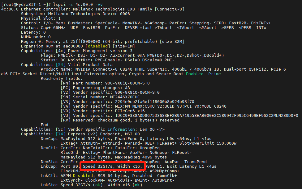 # lspci -s 4c:00.0 -vv - Retrieve the PCIe properties of Auxiliary Cable, which should now be Gen5 x16, as shown in the following figure. The value of the -s parameter comes from the output in Step 1. Verify that the output says "Speed 32GT/s, Width x16" as highlighted.