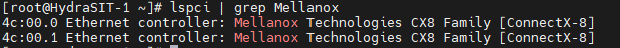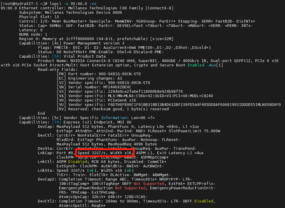 # lspci | grep Mellanox - Verify that the ConnectX-8 adapter, which becomes Gen5 x16, as shown in the following figure. The value of the -s parameter comes from the output in Step 1. Verify that the output says "Speed 32GT/s, Width x16" as highlighted.
