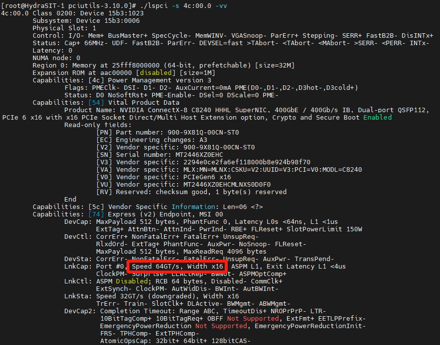 # lspci -s 4c:00.0 -vvVersion of lspci: Only recent versions of the pciutils package (which includes lspci) can recognize the rate of PCIe Gen6. Versions of lspci 3.10.0 and above have been tested and confirmed to support PCIe Gen6, however the inbox version of pciutils does not support Gen6.