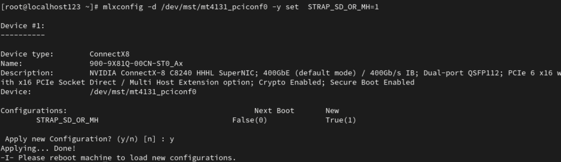 # mlxconfig -d /dev/mst/mt4131_pciconf0 -y set STRAP_SD_OR_MH=1 -