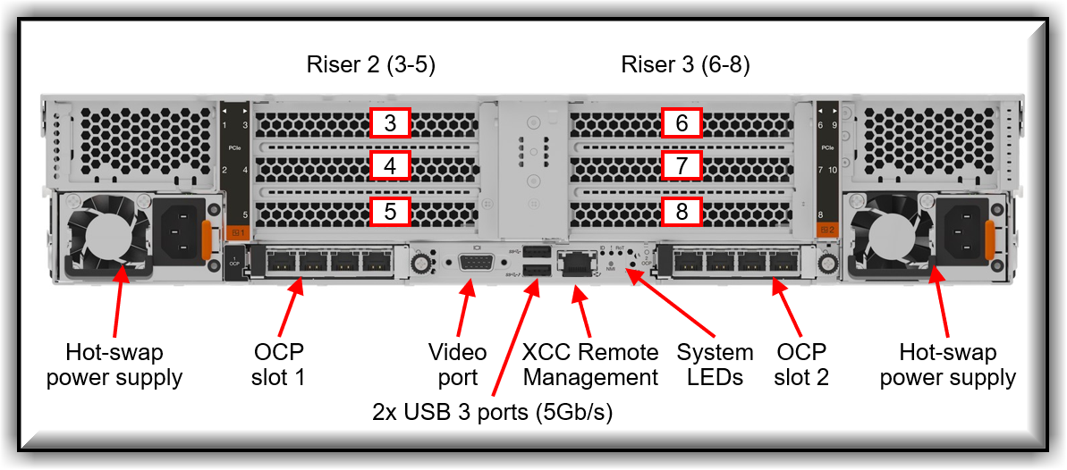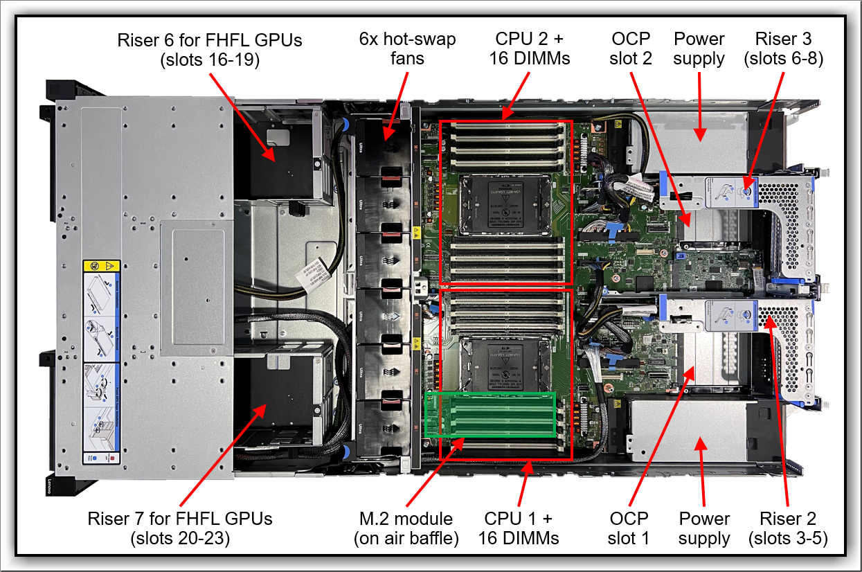 The ThinkAgile VX650a V4 server supports four double-wide GPUs at the front of the server, including the NVIDIA H100 NVL GPUs. The configuration of the slots means that two GPUs can be connected together using high-speed NVLink connections. Such connectivity is ideal for demanding workloads such as AI training and inference.