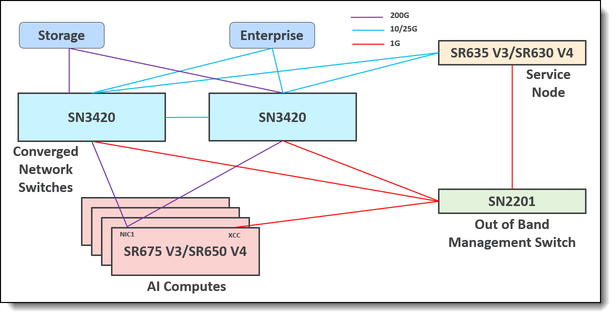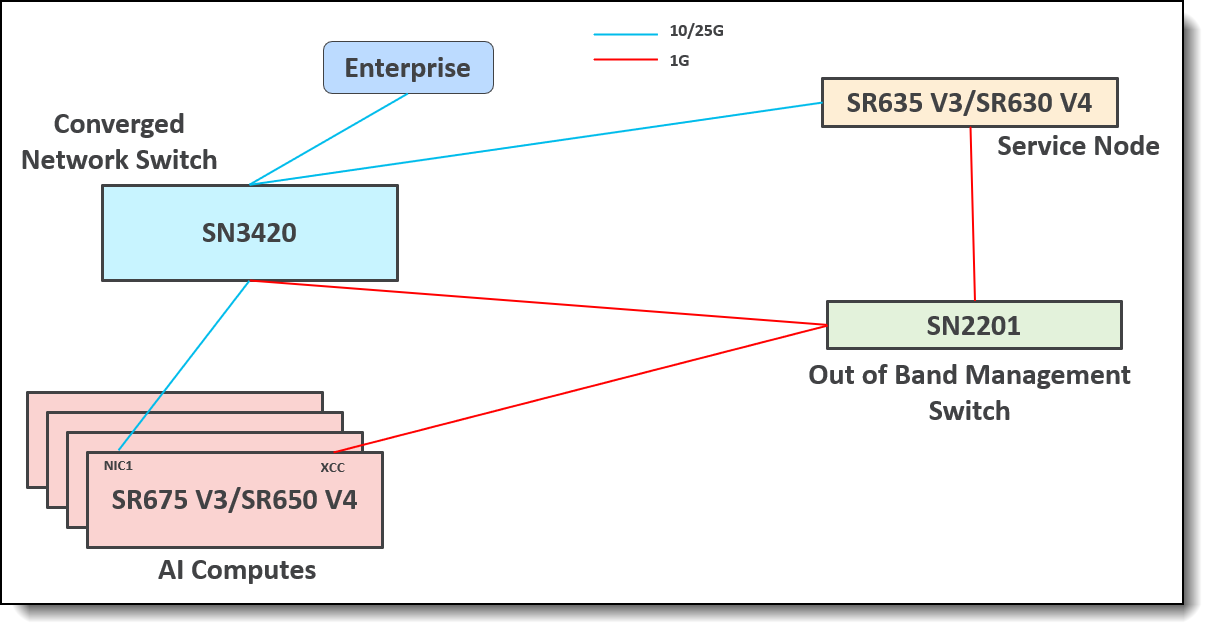 The default setup of the Lenovo Hybrid AI 221 platform leverages NVIDIA SN3420 switch for Converged Network and the NVIDIA SN2201 switch for out-of-band management. As an alternative, Cisco Networking with the Cisco Nexus 93240YC-FX2 for the Converged Network and the Nexus 9300-FX3 for the Management Network can also be used. A 10/25GE adapter with minimum 2 ports is added to both AI computes and service nodes.