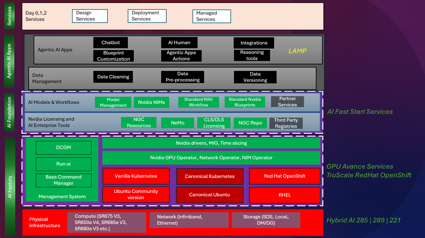 - GPU Advance Services provide the foundation needed for AI use case development, including AI factory design, deployment of the software and firmware stack, and setup of orchestration software. Optionally, TruScale RedHat OpenShift service can be added for those wanting to use OpenShift on RHEL.