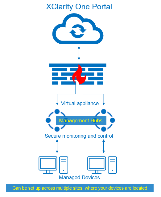 Hardware data is transferred from the managed devices to the management hub and then to the XClarity One portal using HTTPS. Managed devices are not directly connected to the XClarity One portal.