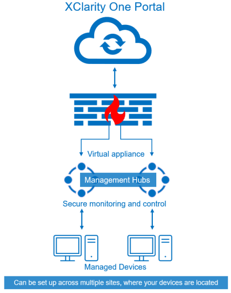 XClarity One can be installed flexibly. Today this allows XClarity One to be hosted in the Lenovo cloud with on premise management hubs or as a fully on-premises solution.