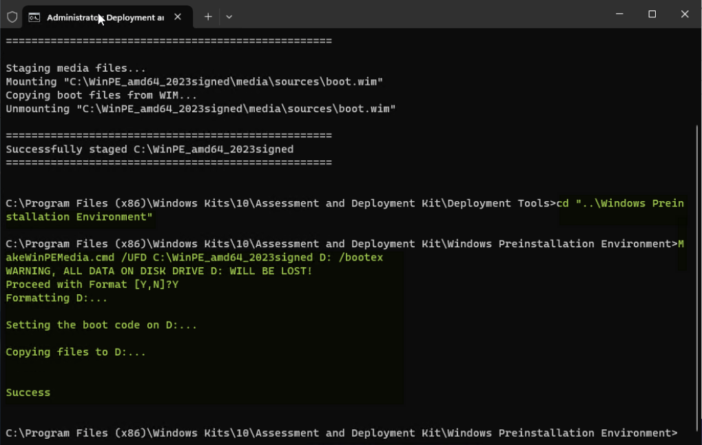 cd "..\Windows Preinstallation Environment" MakeWinPEMedia /UFD C:\WinPE_amd64_2023signed [USB drive letter]: /bootex