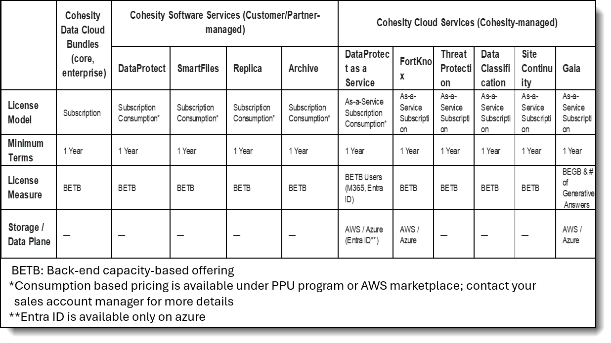 Cohesity software is packaged as Services that can be run on any supported Cohesity cluster. Each Service entitles customers to all the cluster services, storage capacity, and data management features needed for the use case. Service licenses are licensed in backend terabytes (BETB) unless otherwise noted.