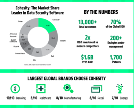 The combination of Cohesity with Veritas’ enterprise data protection business, closed at the end of 2024 (read more) created the largest data protection and management organization globally with a significantly expanded market presence, serving over 13,000 customers, including more than 85 of the Fortune 100 and nearly 70% of the Global 500.