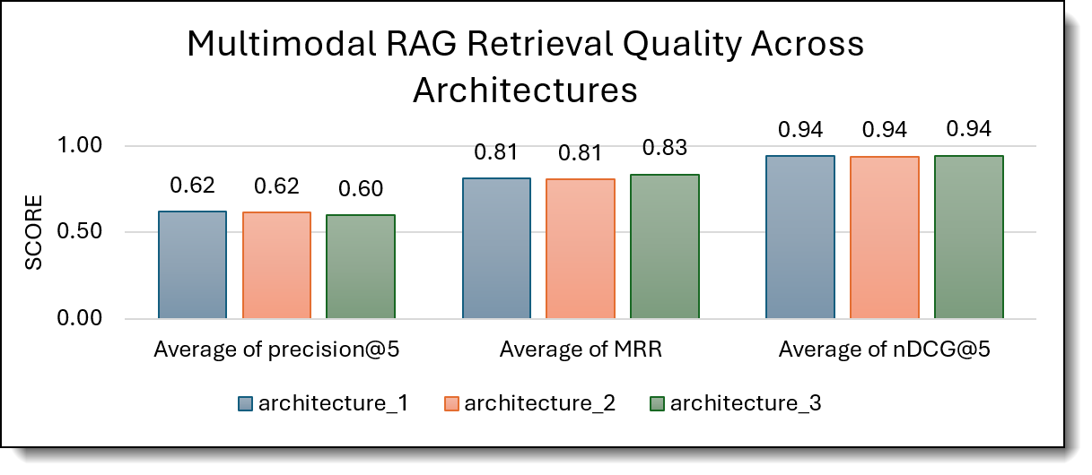 - Architecture 3 delivers the strongest answer quality, indicating that multimodal embedding–based retrieval can improve completeness and faithfulness when paired with multimodal generation.