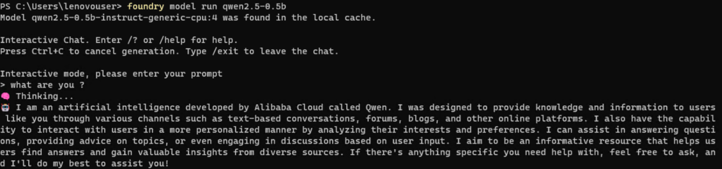 - Once loaded, you can chat with the model directly in the command prompt for immediate testing.