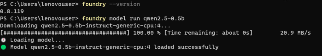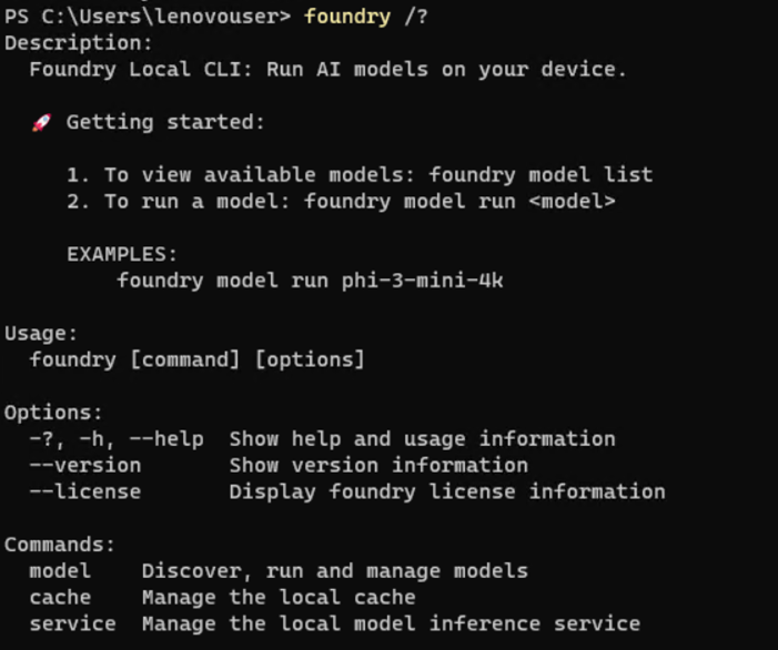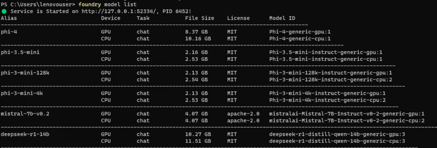 - Use foundry model list to see the available catalog (e.g., Phi, Mistral, Qwen, DeepSeek).