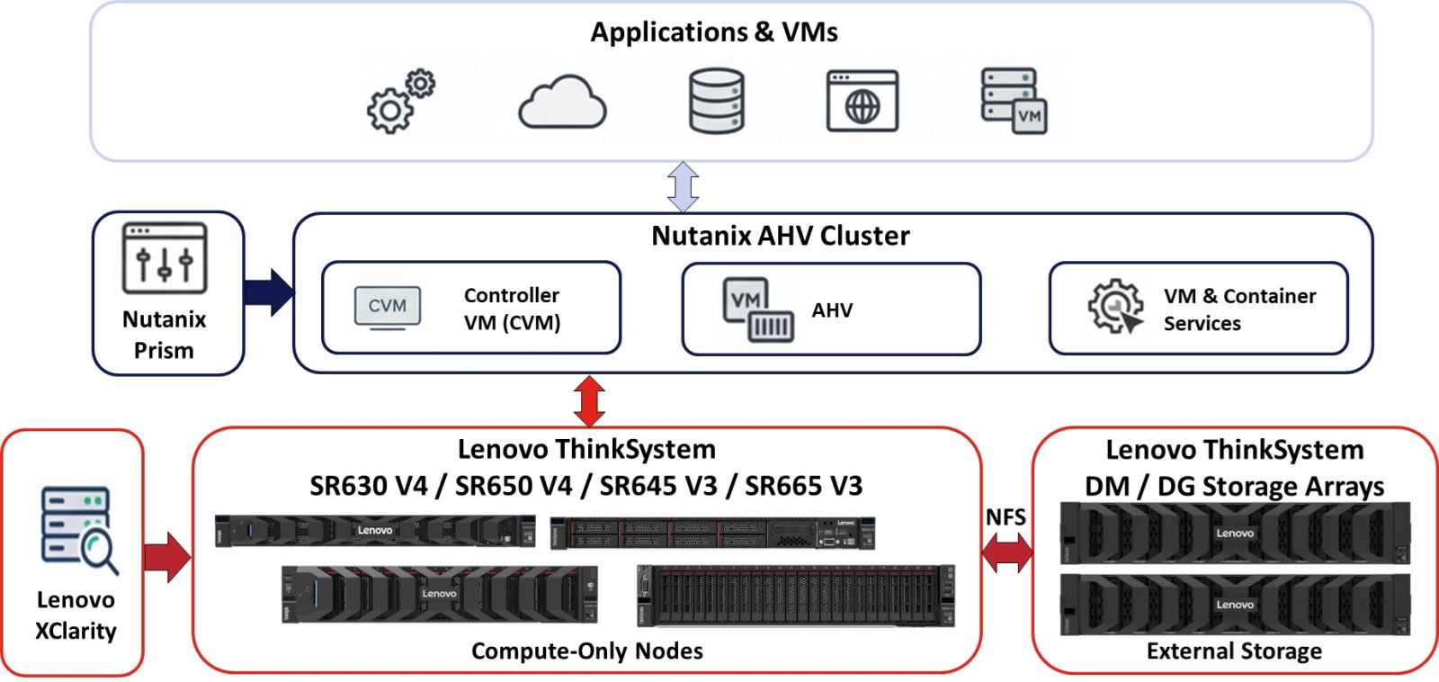 In practical terms, this means organizations gain the core benefits of Nutanix's integrated hypervisor—simplicity, resiliency, and cloud-like management—while using externally attached storage such as Lenovo ThinkSystem DM/DG Series. The result is an agile infrastructure that unifies compute and virtualization management while leveraging existing storage investments or preferences.