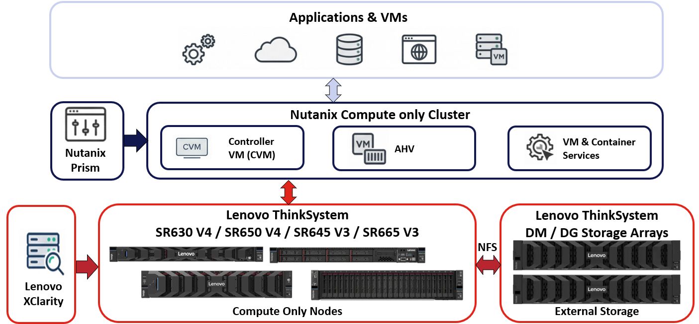 - Enterprise Data Center Virtualization: Consolidate general-purpose VMs and enterprise applications on a resilient Nutanix Compute only Cluster cluster powered by Lenovo ThinkSystem servers.