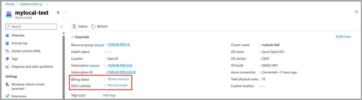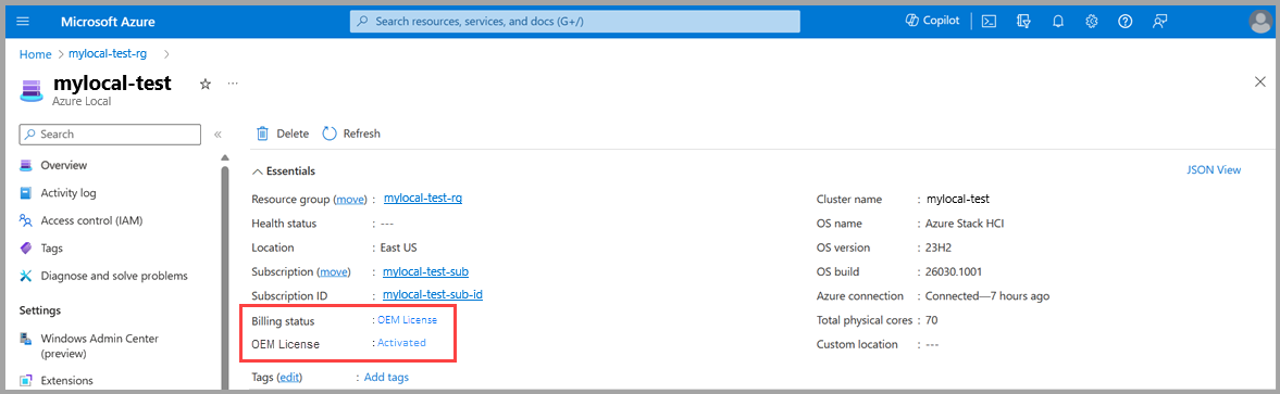 If you have an active OEM license for Azure Local, your billing status should be OEM License, and your OEM license status should be Activated.