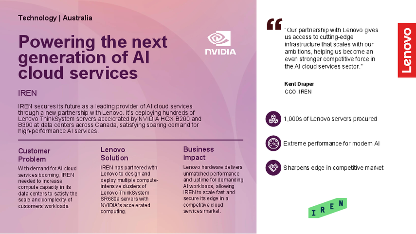IREN unlocks unmatched levels of performance for its cloud AI services with the latest Lenovo ThinkSystem SR680a servers with NVIDIA’s accelerated computing.
